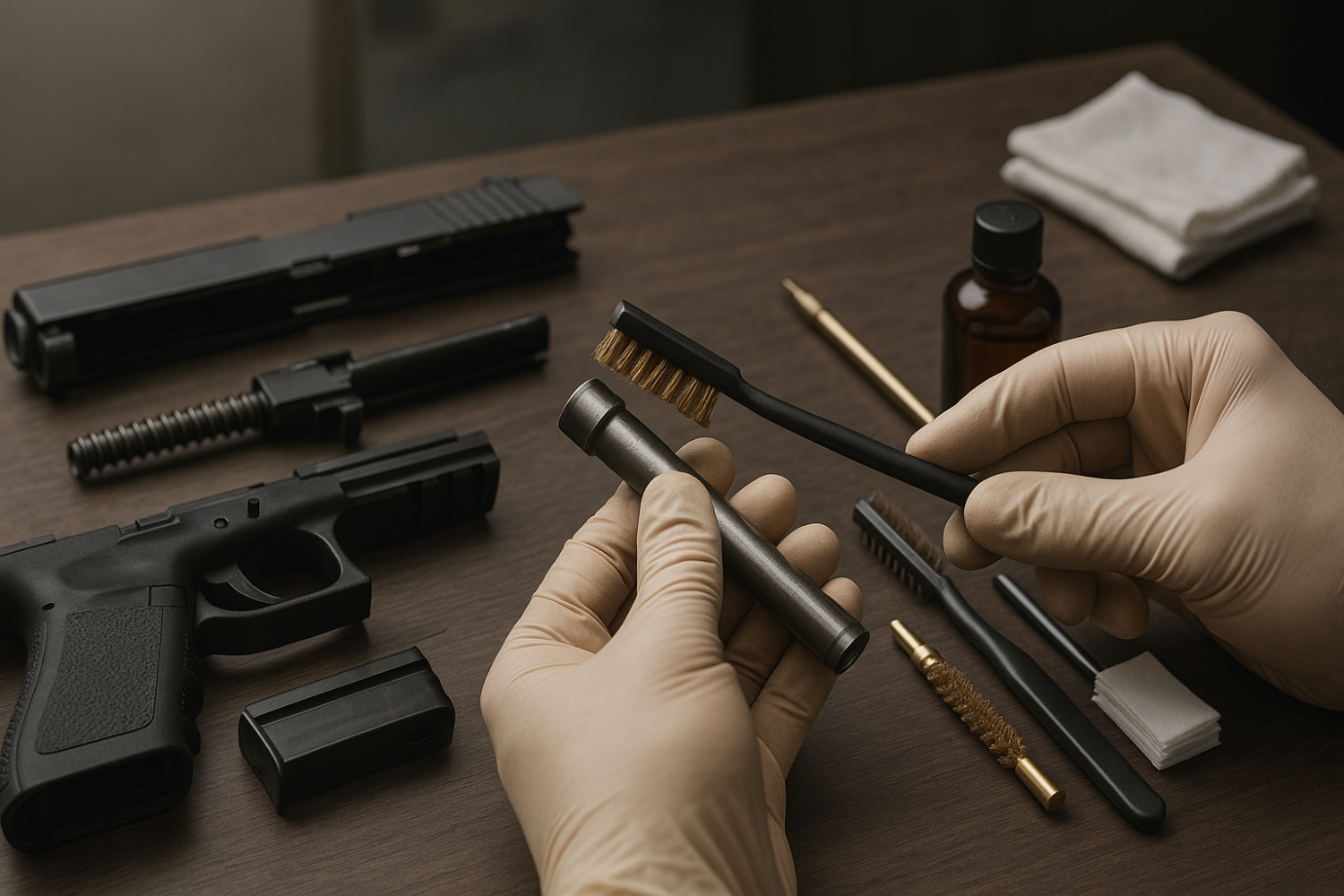 Перед началом чистки безопасность стоит на первом месте. Оружие полностью разряжается, магазин извлекается, патронник проверяется визуально и тактильно. Рабочее место должно быть хорошо освещено и очищено от посторонних предметов, чтобы мелкие детали не потерялись.