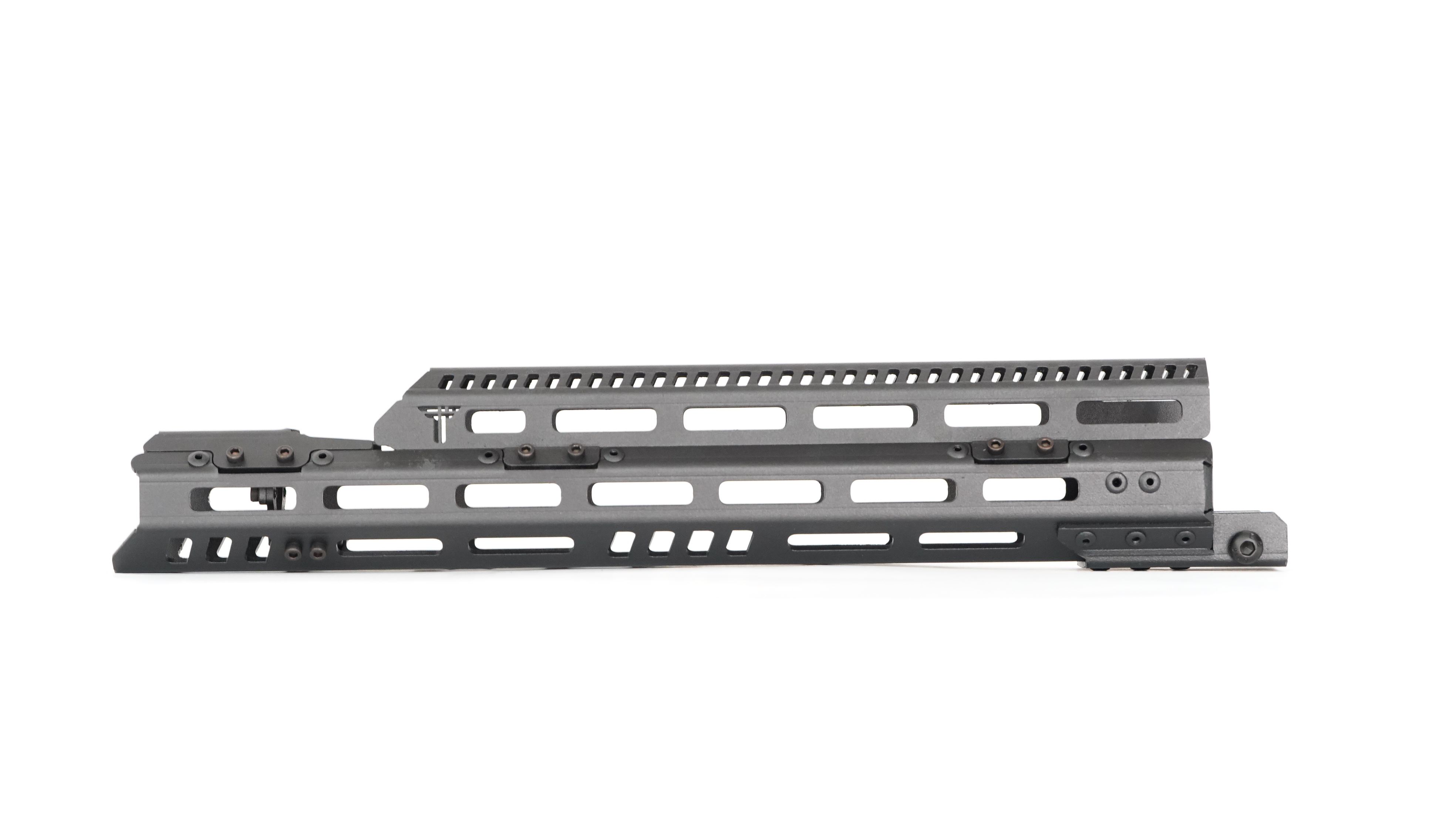 Цевьё закрывает все пространство от ствольной коробки до дтк и обеспечивает удобный безопасный хват по всей своей длине. Все поверхности цевья оборудованы ячейками крепления типа М-Лок.